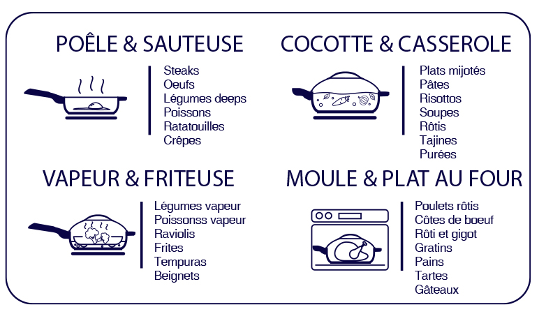 Oeufs au plat, poulets rôtis, légumes vapeur, blanquette de veau, frites, gratin, gâteaux, pizza… Tout est possible ! Compatibilité tous feux