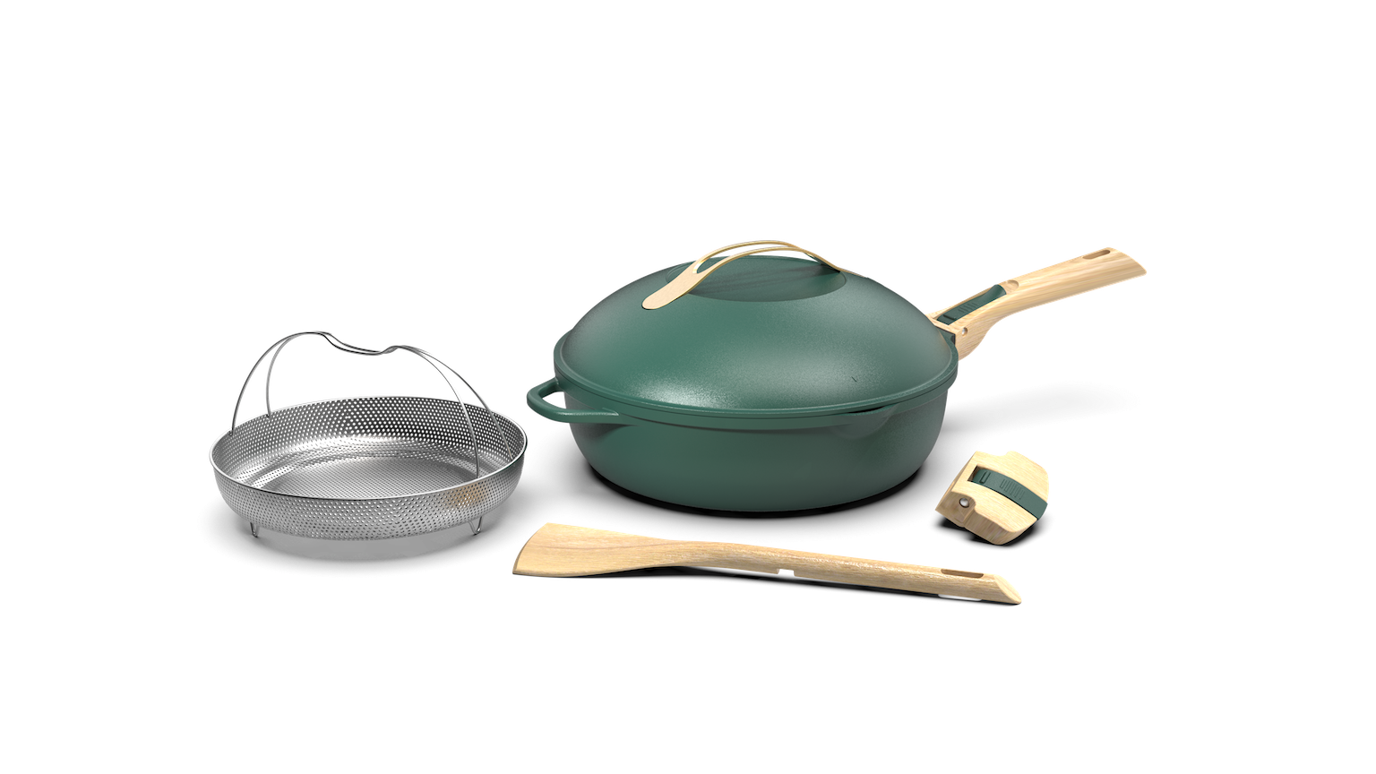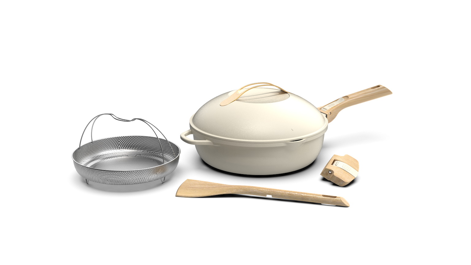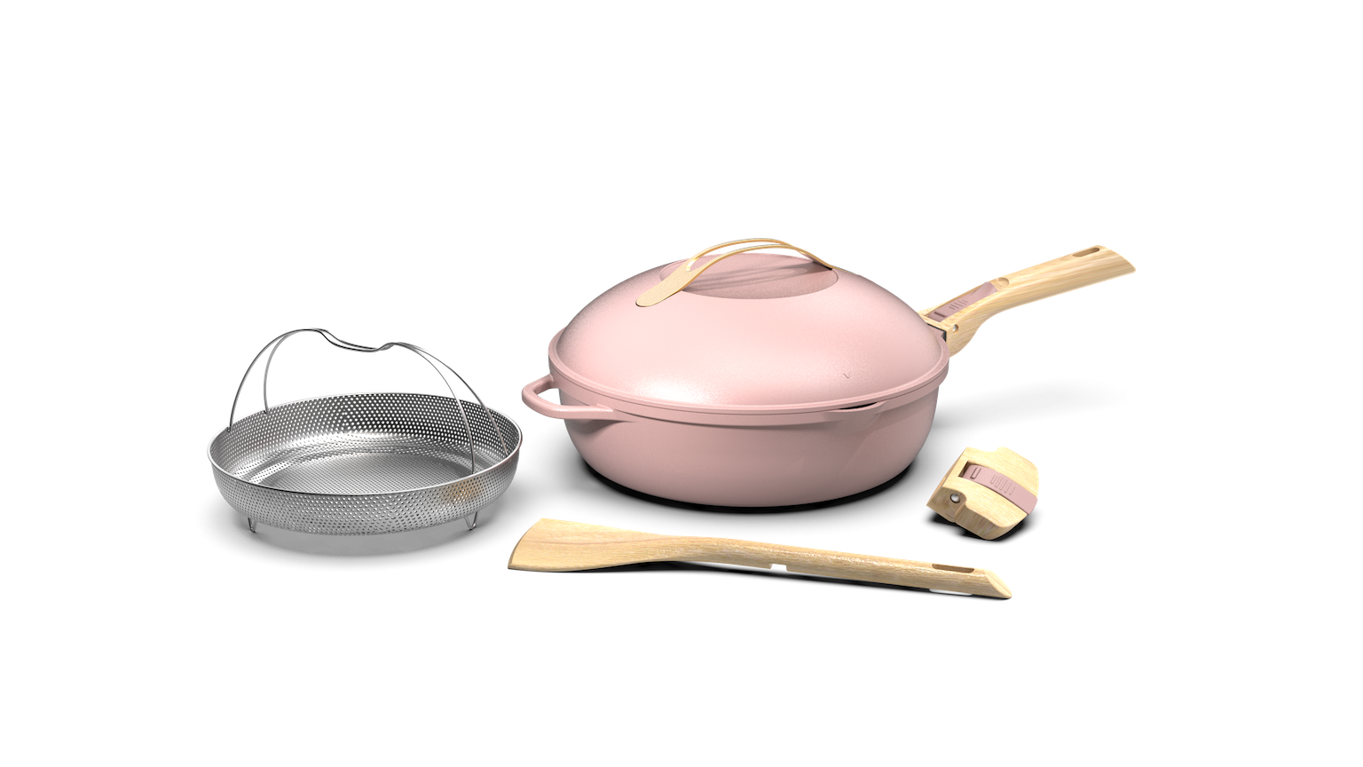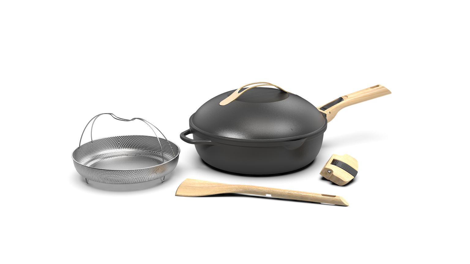 Inclus : 2 poignées détachables (une longue et une courte), un panier vapeur et une spatule en bois.